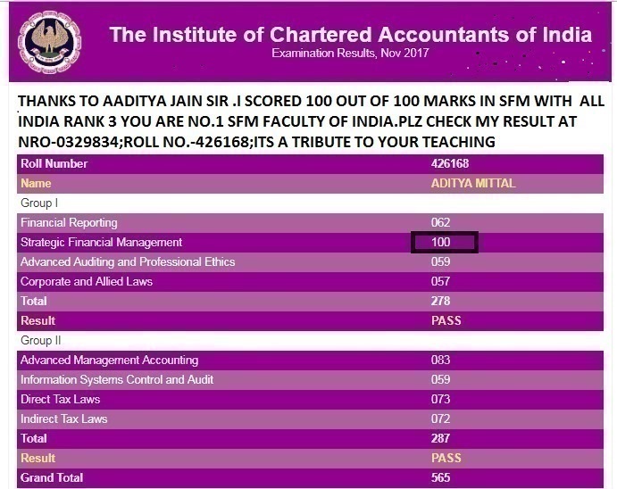 Recently his student "Aditya Mittal"in Nov 17 scored 100 out of 100 marks in SFM.(with AIR-3 ;Roll No.-426168;NRO No.-0329834).You can view his interview video link from You Tube:https://www.youtube.com/watch?v=2r7WJt4-6iY&t=613s